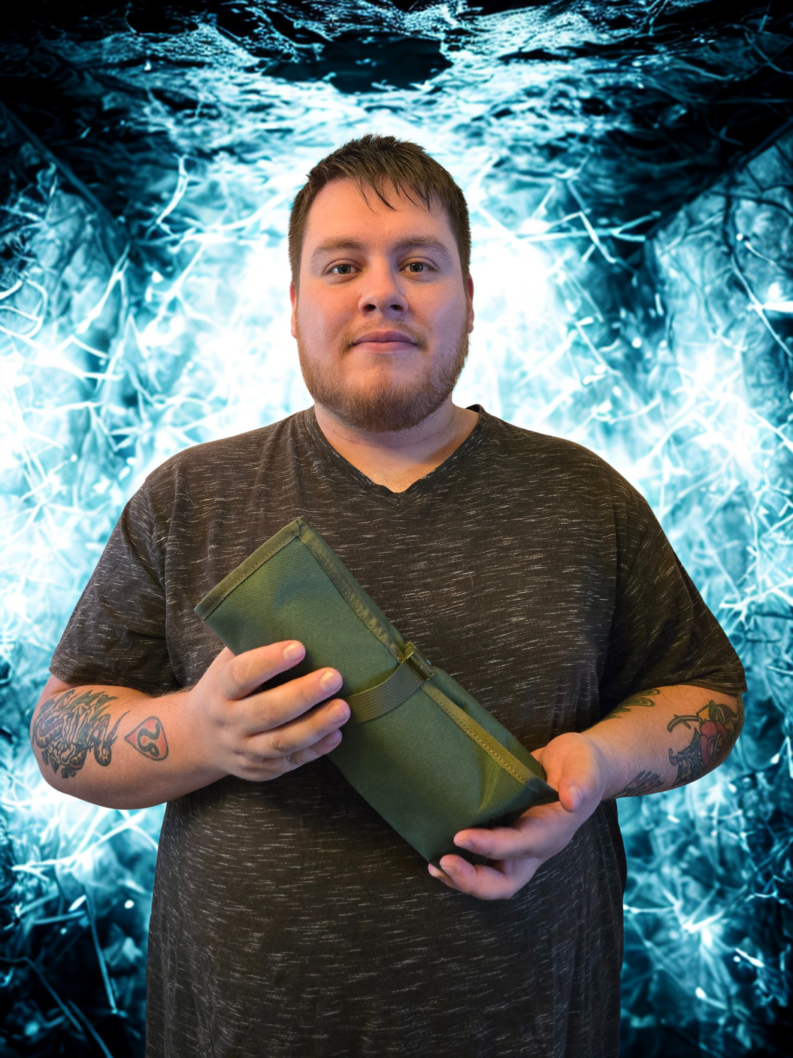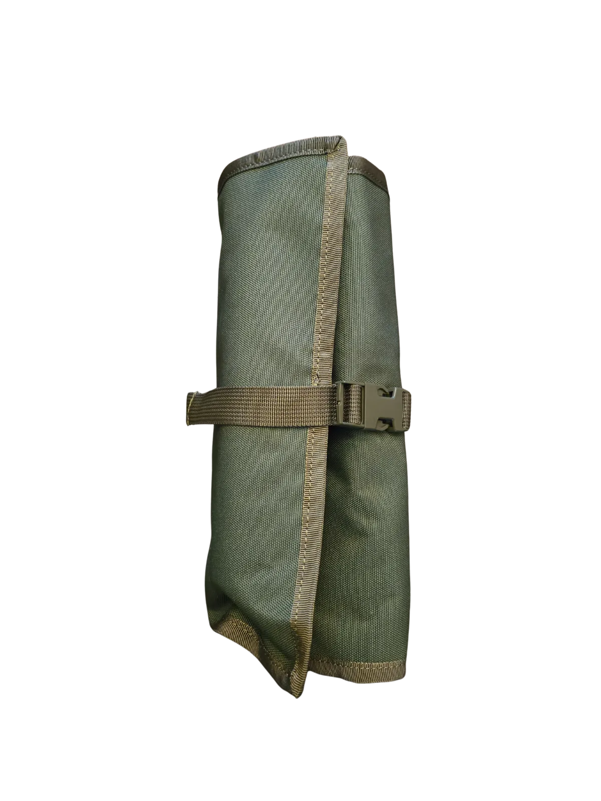 It rolls up with a adjustable clip to keep it tight so nothing falls out